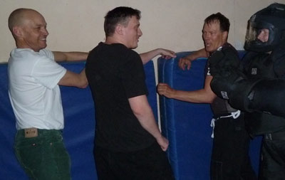 Aus dem aggressiven Angreifer wird wieder Andreas Bölsch, einer der zahlreichen Trainer des Vereins. Er steckt in einem so genannten Vollkontaktschutzanzug (FIST Police Training Suit), damit der Verteidiger auch mal ordentlich zurückschlagen könnte.