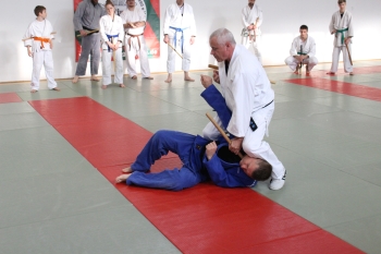 Nach der Mittagspause, mit einer leckeren Kartoffelsuppe mit Würstchen, setzte Thomas den Lehrgang mit Stocktechniken mit ein und zwei Stöckern fort. Cabca 1-3, Block-, Entwaffnungs- und Festlegetechniken konnten nun trainiert werden.