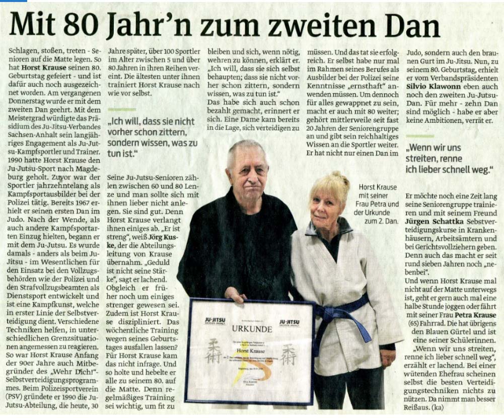 Doch das wirklich Besondere ist für Insider die fast schon familiäre Stimmung in der Gruppe, die von jedem "Neuen" sofort als angenehm empfunden wird und eine gute Ausgangsbasis bietet. Zusammenfassend sorgt das gemeinsame Sporttreiben bis ins hohe Alter nicht nur für eine gute Kondition und damit für ein "Mehr" an Lebensqualität, sondern macht in der Gemeinschaft Gleichgesinnter richtig Spaß. Aus diesem Grunde dürfte auch im neuen Jahr noch so manches Mal von den Magdeburger "Ju-Jutsu-Senioren" zu hören und zu lesen sein.