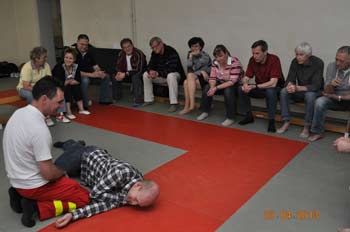 Die Minuten bis professionelle Hilfe eintrifft, können für den Betroffenen entscheidend sein über Leben und Tod ....Die Ju-Jutsu-Senioren hatten sich an diesem Tage mit Michael Perniok vom Polizeiärztlichen Zentrum Magdeburg einen Experten in Sachen "Erste Hilfe" eingeladen, der ihnen gleich zu Anfang bestätigte: "Es hat sich viel geändert" und damit die Notwendigkeit unterstrich, sich immer wieder mal mit diesem Thema zu beschäftigen.