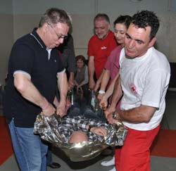 Ausgehend von den neuen ERC (Europen Resuscitation Council) - Leitlinien aus dem Jahr 2010 und dem Grundsatz "einfach zu lernen und zu merken" machte er gleich zu Anfang Schluss mit der Angst vor "irgendwelchen" komplizierten Übungen, die sich über die Zeit ohnehin kaum im Detail merken, geschweige denn von Laien anwenden lassen. In seiner lockeren, sympathischen Art demonstrierte er in drei Schritten die stabile Seitenlage und legte dann viel Wert auf eine selbst bei noch vorhandener Schnappatmung sofort einsetzende Herzdruckmassage.